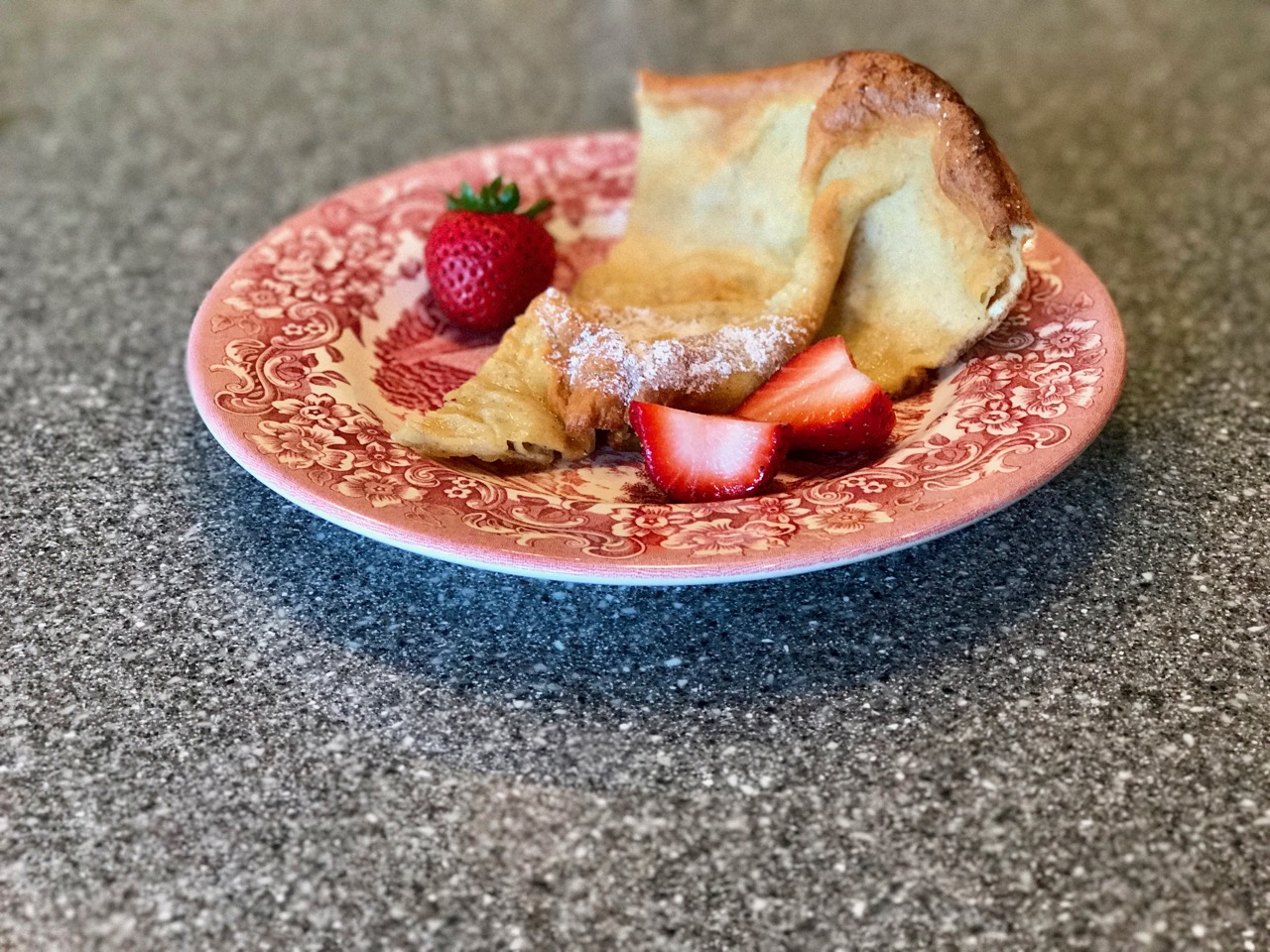 Sprinkle some confectioners sugar on the top and add some fresh strawberries to complete the delicious dutch baby.